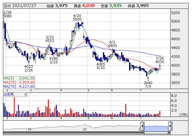 9629>はストップ高買い気配。前日に第1四半期決算を発表、営業利益は9.7億円で前年同期比2.1倍となっている。据え置きの通期計画18.7億円に対する進捗率は52.3%の水準に。21年12月にサポート終了を迎える「PCA Xシリーズ」の更新需要に伴い、製品売上高が大幅に増加したようだ。9月末を基準とした1:3の株式分割実施も発表、年間配当金は34円から12円に修正、分割考慮前基準では実質2円の増配となる。