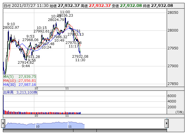 日経平均 <1分足> 「株探」多機能チャートよりきょう前場の東京株式市場は買い優勢の展開で日経平均は続伸した。前日の米国株市場でNYダウなど主要株指数が上げ幅こそ小さいものの上値指向を継続し、過去最高値更新が続いていることから、出遅れ感の強い東京市場にも投資資金が流入している。ただ、国内で新型コロナウイルスの感染拡大が続いていることや、米国であすまでの日程で行われるFOMCの結果とパウエルFRB議長の記者会見を見届けたいとの思惑もあり、買い一巡後は前引けにかけて伸び悩む展開となっている。前場の売買代金は1兆円を下回った。