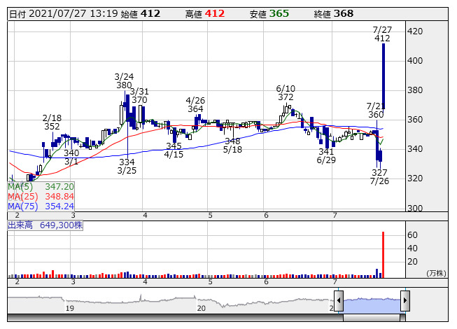 ウィル <日足> 「株探」多機能チャートよりウィルは関西を地盤に一戸建て中心に住宅販売を手掛けており、マンションのリフォーム事業などにも力を入れている。同社が26日取引終了後に発表した21年12月期第2四半期(1~6月)の業績予想の修正を発表、売上高は従来予想の28億1100万円から30億4500万円(前年同期比9.7%減)に、営業利益は1億1900万円から2億1400万円(同38.1%増)にそれぞれ増額しており、これを好感する買いを呼び込んだ。住宅を購入する顧客の来店件数が前年同期比で4割強増え、会社側の想定を上回った。また、中古住宅の取扱件数が前年同期比で1.5倍となり、リフォームの引き渡し件数も大幅に増加したことなどが収益を押し上げる形となった。これを材料視する買いが集中し、一時80円高はストップ高となる412円まで上昇する場面があった。