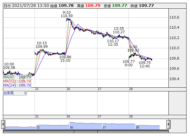 米ドル/円 <5分足> 「株探」多機能チャートより午後の東京外為市場でドル・円は1ドル=109円80銭近辺で推移。調査会社IDCによる中国の第2四半期のスマートフォン出荷は前年同期比-11.0%の7810万台となった。米国による対中制裁により、ファーウェイの格安スマホの出荷が-46.0%となったことが響いたようだ。