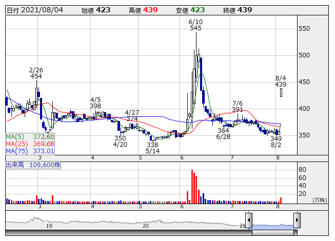ラピーヌ <日足> 「株探」多機能チャートより■ラピーヌ <8143> 439円 (+80円、+22.3%) ストップ高