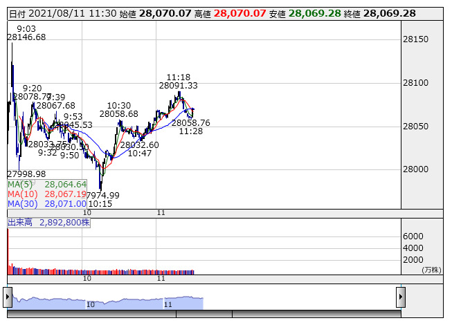 前日10日の米株式市場では、NYダウが162.82ドル高(+0.46%)と反発。超党派インフラ投資法案が米議会上院で可決され実現に向け前進したほか、原油高が支援した。一方、米長期金利の上昇を背景にナスダック総合指数は0.49%安と反落。米インフラ法案の上院可決や米長期金利の反発基調を追い風に、本日の日経平均は前日比157.69円高の28045.84円でスタートすると、取引開始直後に258.53円高の28146.68円まで上値を伸ばした。その後は戻り待ちの売り圧力に押され、上げ幅を縮めたものの、前日のような急失速の展開とはならずに、28000円台を維持する底堅い動きとなった。