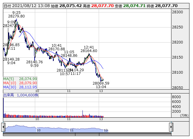 日経平均 <1分足> 「株探」多機能チャートより日経平均 : 28127.91 (+57.40)