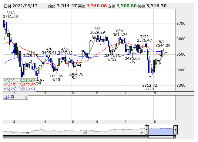 13日の上海総合指数は、主要指標の上海総合指数が前日比8.44ポイント安(-0.24%)の3516.30ポイントと続落した。