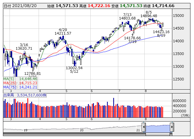 買戻しが優勢となったため、寄り付き後、上昇。緩和縮小を巡りタカ派発言を繰り返してきたダラス連銀総裁のカプラン総裁がデルタ株感染が拡大した場合に方針を修正すると発言し、連邦準備制度理事会(FRB)の早期緩和縮小への脅威も和らぎ相場の上昇を支援。また、ハイテク株の上昇も手伝い、上げ幅を拡大した。セクター別では、ソフトウェアサービスや耐久消費財・アパレルが上昇。食品・飲料・タバコが下落した。