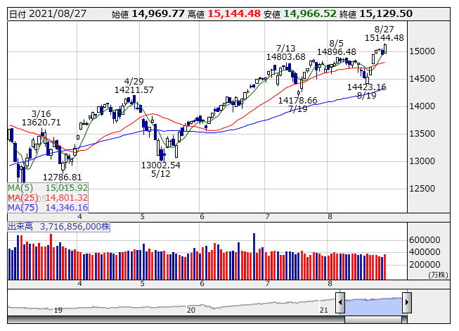 昨日の下げの反動で、寄り付き後、上昇。注目となっていた連邦準備制度理事会(FRB)の年次経済シンポジウムの講演でパウエル議長は年内の資産購入縮小開始が適切となる可能性に言及したものの、利上げには程遠いとタカ派色を強めなかったことから、長期にわたり低金利が継続されるとの期待に買いが強まった。長期金利の低下で、ハイテク株も買われナスダック総合指数は史上最高値を更新して終了。セクター別では、エネルギーや半導体・同製造装置が上昇。医薬品・バイオテクが下落した。