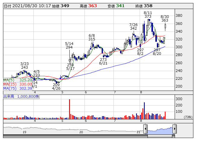 6493>が急動意、商い急増のなかマドを開けて11.7%高の363円まで駆け上がる場面があった。自動車用エンジンバルブメーカーとして、世界的に好調な自動車販売需要を取り込み、22年3月期営業利益は31億5000万円予想(前期実績は1800万円)と急回復見通しにある。エンジンバルブの中に空洞を作り、金属ナトリウムを封入した中空エンジンバルブを戦略的に展開し、とりわけ好採算の傘中空エンジンバルブが業績に寄与している。PERが6倍台であるほか、PBRは解散価値の半値以下である0.4倍台に放置されるなど株価は依然として超割安圏に位置するといってよく、水準訂正高を見込んだ投資資金の流入を誘っている。