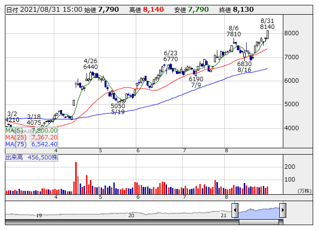 中山製鋼所<5408>=大幅続伸で3カ月半ぶり新高値。鋼板や棒鋼、コイル製品など鉄鋼メーカーの老舗で熱延技術に強みを持っているが、独自技術で製造するNFG(微細粒熱延鋼板)はスーパーメタルとして注目度が高い。22年3月期は営業利益倍増で増配も計画するが、PBRが0.3倍台前半と解散価値の3分の1水準にあることで、依然として割安感が強く意識されている。過去に特定資金の攻勢に伴う大相場を経験し、1990年2月に修正後株価で2万2400円という最高値をつけたことでも知られる。