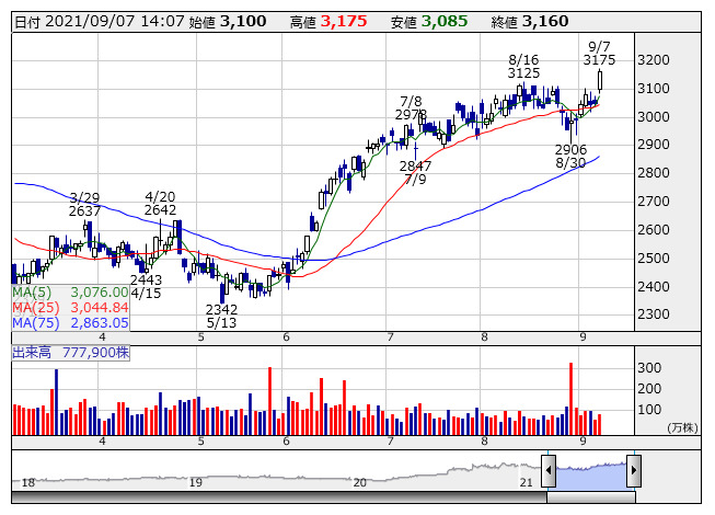 SGHD <日足> 「株探」多機能チャートより同証券では、デリバリー事業の安定した数量確保と適正運賃収受及び採算管理に加えて、ロジスティクス事業の海外フォワーディングが好調で、営業最高益更新が続くと予想。営業利益予想を22年3月期で1130億円から1180億円へ、23年3月期で1150億円から1190億円へ引き上げた。同社の安定した業績と経営は、既に株価評価に反映済みではあるが、23年3月期からの新中期経営計画、特に株主還元施策の強化が今後のカタリストとして注目されるという。