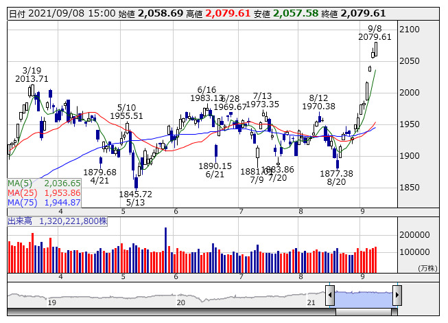 2079.61ポイント 8日TOPIX現物終値