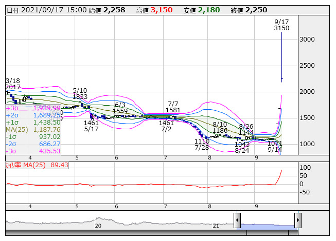 バードマン <日足> ボリンジャー/カイリ率 「株探」多機能チャートより●株価が+3σを上回った銘柄(市場人気順) ★株価の上げ足が速過ぎ、売りが出やすい銘柄