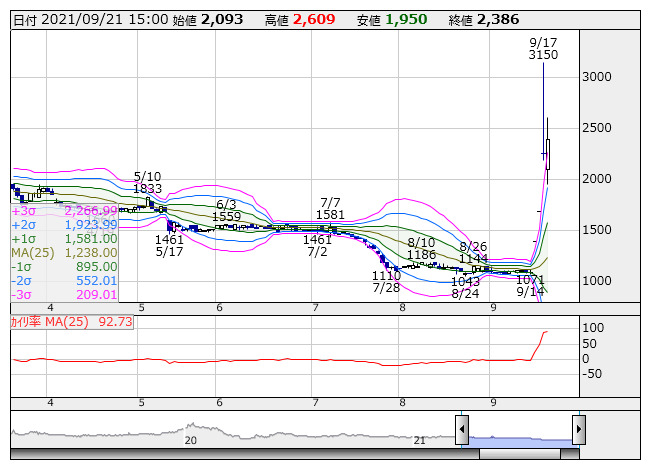 バードマン <日足> ボリンジャー/カイリ率 「株探」多機能チャートより●株価が+3σを上回った銘柄(市場人気順) ★株価の上げ足が速過ぎ、売りが出やすい銘柄