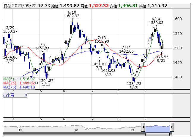 不動産業 <日足> 「株探」多機能チャートより●東証1部33業種 値上がり: 5 業種 値下がり: 28 業種