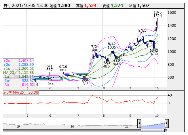 ERIHD <日足> ボリンジャー/カイリ率 「株探」多機能チャートより●株価が+3σを上回った銘柄(市場人気順) ★株価の上げ足が速過ぎ、売りが出やすい銘柄