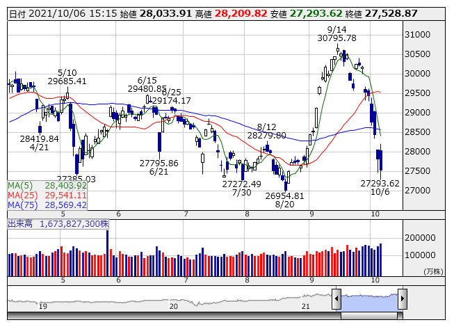 日経平均 <日足> 「株探」多機能チャートより日本取引所が公表した先物手口情報によると、10月6日の日経225ミニ期近(2021年10月限)の日中取引(立会内・J-NETの合算)で、買い越しトップはモルガンMUFG証券の1万8118枚、売り越しトップはシティグループ証券の1万8610枚だった。