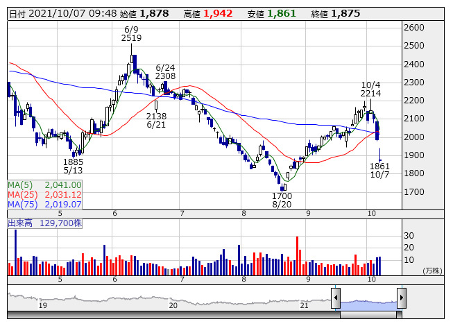 イオンファン <日足> 「株探」多機能チャートより売上高見通しも700億円から600億円(前期比30.1%増)へ引き下げた。新型コロナウイルスのデルタ株の影響による感染拡大によって、当初計画より売り上げの回復が遅れていることが主な要因となる。あわせて、期末配当予想を15円から5円へ減額し、年間配当を20円(前期30円)とする見通しを示した。