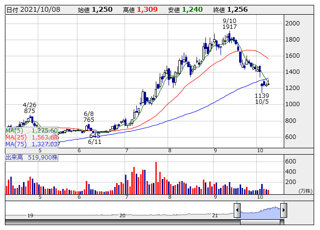 バイク王 <日足> 「株探」多機能チャートより―決算で売られた銘柄! 下落率ランキング―