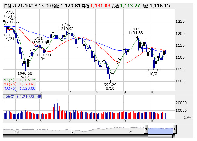 1116.15ポイント 18日東証マザーズ指数現物終値