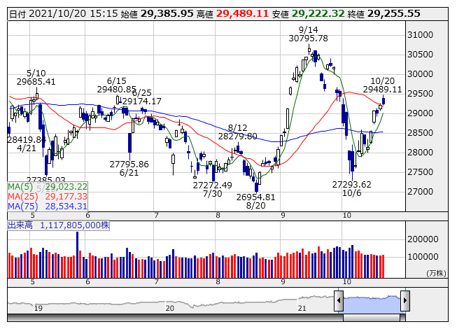 原油など資源価格の上昇と世界的に景気停滞と物価上昇が同時進行するスタグフレーションへの警戒感、米国による年内のテーパリング(量的緩和の縮小)の開始、衆院選の行方など不透明要因も残っており、積極的に買い上がる雰囲気にはなっていない。心理的な節目である29500円に接近したことで、いったんは利食いも出やすい水準だろう。そのため、更なる上昇については、総選挙で自民党が圧勝することや、良好な企業業績を確認するといった材料が不可欠であり、しばらくは外部環境などをにらみながらの動きとなりそうだ。