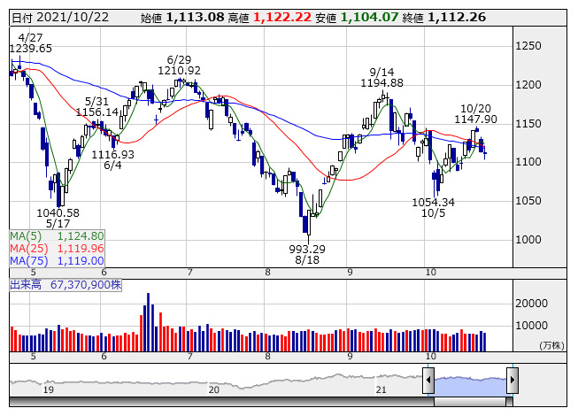 1112.26ポイント 22日東証マザーズ指数現物終値