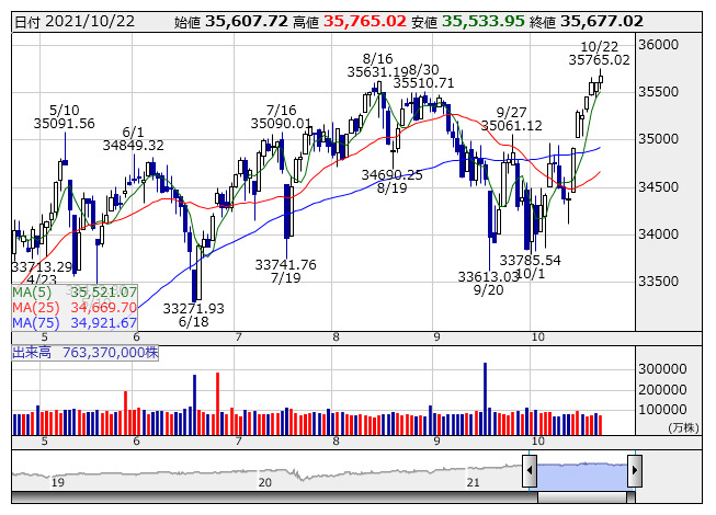 NYダウ <日足> 「株探」多機能チャートより25日の日本株市場は、こう着感の強い相場展開が見込まれる。22日の米国市場はNYダウが73ドル高だった。中国恒大のドル建て債利払い実施で短期的な破たんリスク後退で安心感が広がった。また、10月PMIの上昇も手伝いNYダウは最高値を更新。米連邦準備制度理事会(FRB)のパウエル議長が討論会でインフレのリスクに言及すると早期の利上げ観測が強まり、下落に転じる場面も見られたものの、引けにかけては好決算を受けた買いから上昇に転じていた。シカゴ日経225先物清算値は大阪比140円安の28730円。円相場は1ドル113円50銭台で推移している。