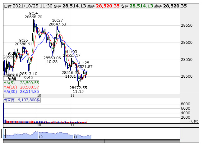 【市況】日経平均25日前引け=反落、284円安の2万8520円