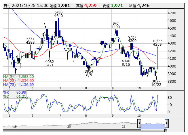 <4519> 中外製薬 4246 +405 (+10.5%) 4034.6