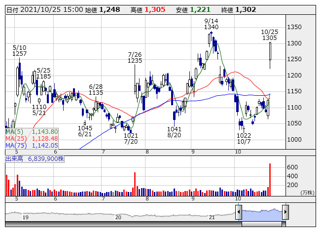 <5423> 東京製鐵 1302 +179 (+15.9%) 1143.8 1128.5