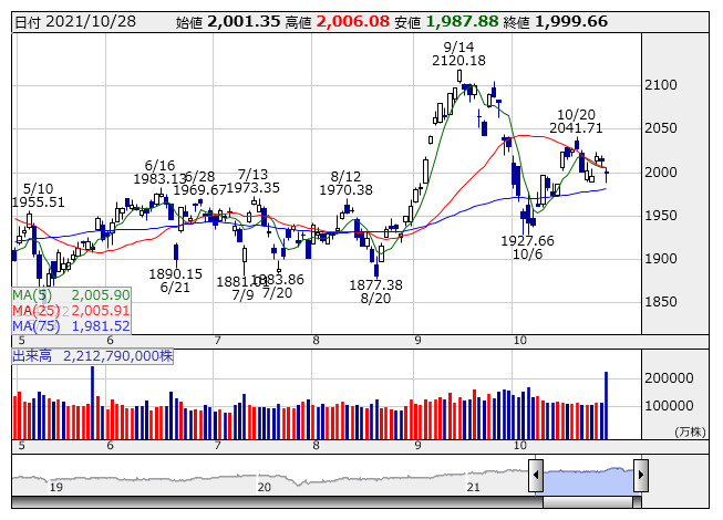 2021年10月29日08時46分 【市況】TOPIX先物:29日寄り付き=0.5ポイント安、1995ポイント TOPIX <日足> 「株探」多機能チャートより 29日8時45分、TOPIX先物期近2021年12月限は前日清算値比0.5ポイント安の1995ポイントで寄り付いた。前日のTOPIXの現物終値1999.66ポイントに対しては4.66ポイント安。夜間取引の終値2002ポイントに対しては7ポイント安となっている。 株探ニュース