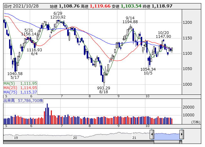 2021年10月29日08時46分 【市況】マザーズ先物:29日寄り付き=1ポイント高、1115ポイント マザーズ指数 <日足> 「株探」多機能チャートより 29日8時45分、東証マザーズ指数先物期近2021年12月限は前日清算値比1ポイント高の1115ポイントで寄り付いた。前日の東証マザーズ指数の現物終値1118.97ポイントに対しては3.97ポイント安。夜間取引の終値1121ポイントに対しては6ポイント安となっている。 株探ニュース