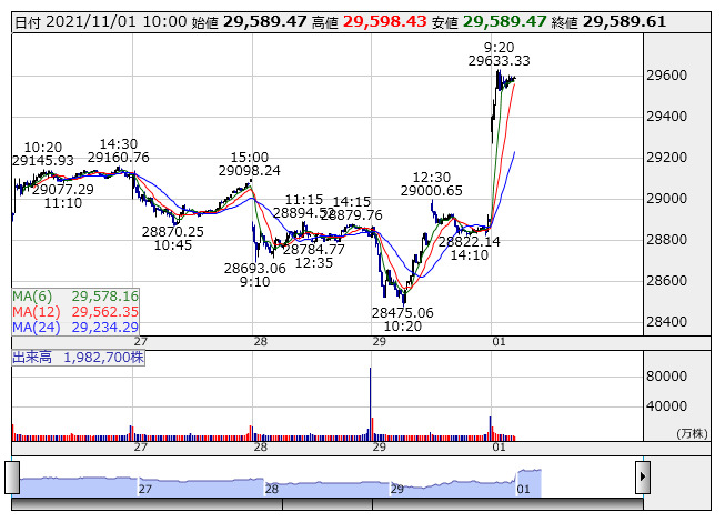 【市況】10時の日経平均は703円高の2万9596円、ファストリが127.59円押し上げ