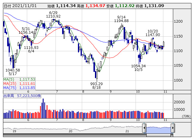 1131.09ポイント 1日東証マザーズ指数現物終値