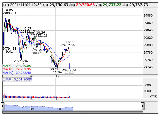 3日の東京市場は文化の日の祝日で休場だったが、米株式市場ではNYダウが2日138ドル高、3日104ドル高となった。3日まで開催された連邦公開市場委員会(FOMC)では予想どおり量的緩和の縮小(テーパリング)開始が決まったが、パウエル連邦準備理事会(FRB)議長は「インフレは一時的」との見方や利上げへの慎重姿勢を再表明。総じてハト派的な内容と受け止められ、主要株価指数は揃って連日で過去最高値を更新した。東京市場では2日の取引でFOMCを前に持ち高調整の売りが出ていたため、FOMC結果を受けた米株高が安心感につながり、祝日明けの日経平均は338円高からスタート。朝方には一時29880.81円(359.91円高)まで上昇したが、本日発表されるトヨタ自<7203>決算や5日に発表される米10月雇用統計の内容を見極めたいとの思惑もあり、やや上値の重い展開となった