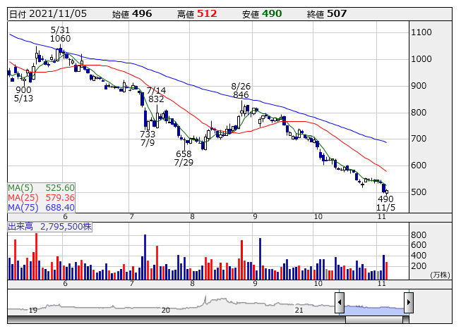 アンジェス <日足> 「株探」多機能チャートより(東証上場 4048 銘柄対象[ETF、REIT含む])