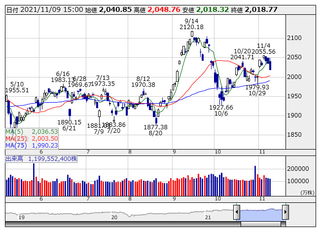 2021年11月09日15時17分 【市況】TOPIX先物:9日清算値=11.5ポイント安、2022ポイント TOPIX <日足> 「株探」多機能チャートより 9日15時15分、TOPIX先物期近2021年12月限は前日清算値比11.5ポイント安の2022ポイントで取引を終えた。出来高は4万8988枚だった。この日のTOPIXの現物終値2018.77ポイントに対しては3.23ポイント高。 株探ニュース