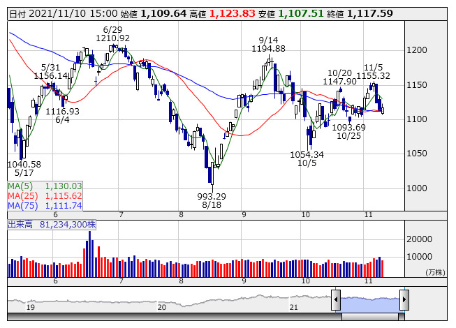 1117.59ポイント 10日東証マザーズ指数現物終値