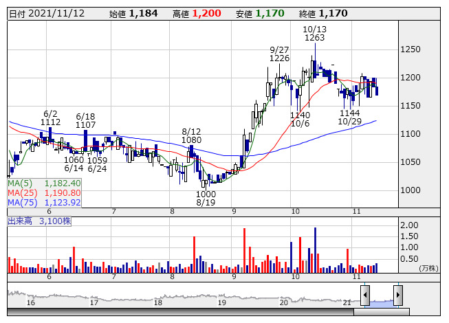 ピクスタ <日足> 「株探」多機能チャートより11月8日~12日に、通期業績を70%以上上方修正した銘柄から、経常利益の上方修正率の高い順に記した。なお、黒字転換や赤字縮小は除いた。