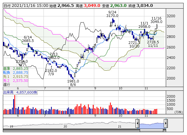 3)株価が均衡表の「雲(抵抗帯)」を上回る