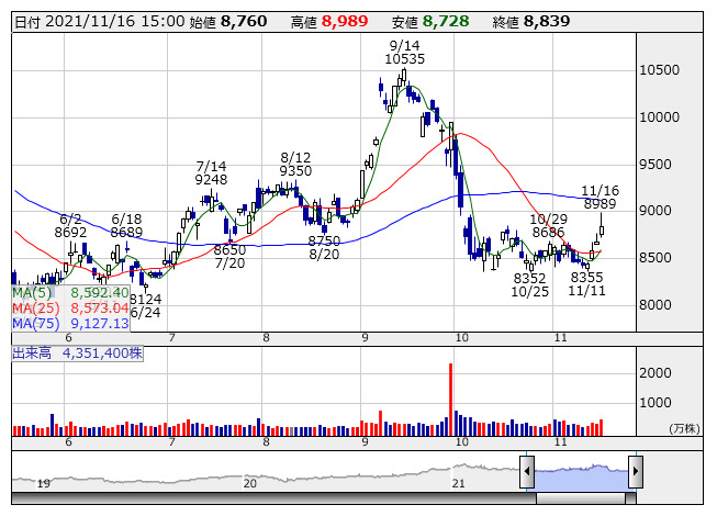 <6981> 村田製作所 8839 +158 ( +1.8%) 8592.4 8573.0