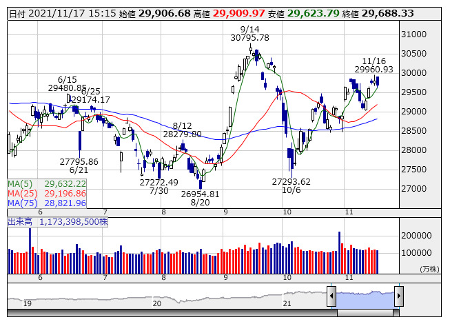 日経平均 <日足> 「株探」多機能チャートより日本取引所が公表した先物手口情報によると、11月17日の日経225ミニ期近(2021年12月限)の日中取引(立会内・J-NETの合算)で、買い越しトップはABNクリアリン証券の3635枚、売り越しトップはバークレイズ証券の4280枚だった。