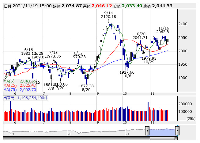 TOPIX <日足> 「株探」多機能チャートより日本取引所が公表した先物手口情報によると、11月19日のTOPIX先物期近(2021年12月限)の日中取引(立会内・J-NETの合算)で、買い越しトップはJPモルガン証券の1182枚、売り越しトップはソシエテG証券の1367枚だった。