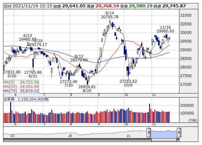 日経平均 <日足> 「株探」多機能チャートより日本取引所が公表した先物手口情報によると、11月19日の日経225先物期近(2021年12月限)の日中取引(立会内・J-NETの合算)で、買い越しトップはHSBC証券の1805枚、売り越しトップはみずほ証券の2861枚だった。