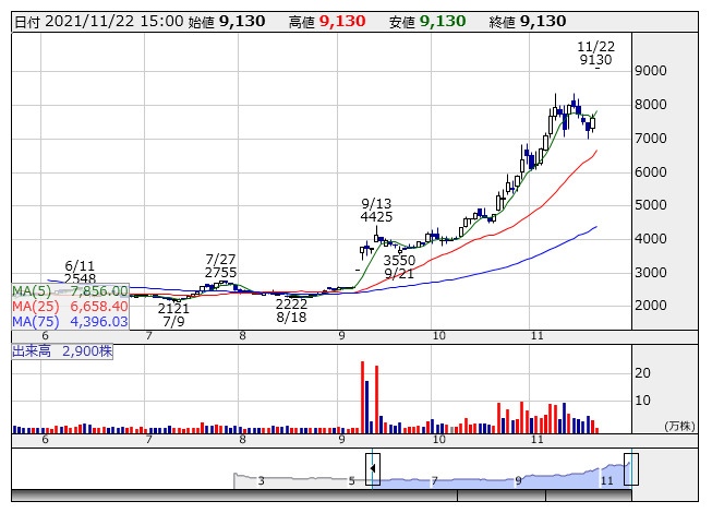 アールプランナー <2983> [東証M]がストップ高。9130円まで買われ、上場来高値を更新した。前週末19日の取引終了後、22年1月31日を基準日として1株を4株に株式分割すると発表したことを好感した買いが入った。投資単位当たりの金額を引き下げることで、株式の流動性の向上と投資家層の拡大を図ることが目的という。なお、効力発生日は2月1日。