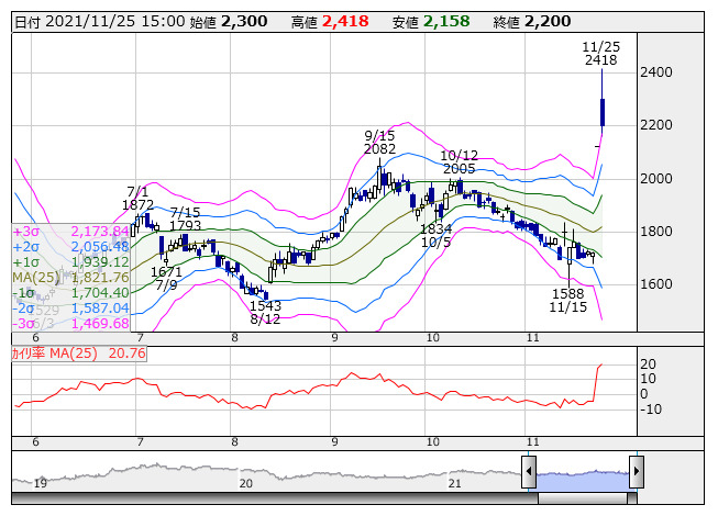 そーせい <日足> ボリンジャー/カイリ率 「株探」多機能チャートより●株価が+3σを上回った銘柄(市場人気順) ★株価の上げ足が速過ぎ、売りが出やすい銘柄