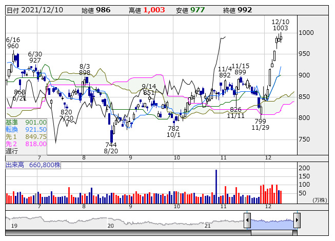 ニッパツ <日足> 一目均衡表 「株探」多機能チャートより本特集では、テクニカル指標「一目均衡表」のなかでも最も強い買いシグナルである「3役好転」と企業の持つ株主資本(純資産)からみた株価指標で、理論上の解散価値を示す「PBR」に注目。東証1部において、上昇トレンドを示唆した可能性が高い「3役好転」を示した 20銘柄から、PBRが東証1部平均の 1.29倍以下で上値余地があるとみられる 12社を選び出しました。