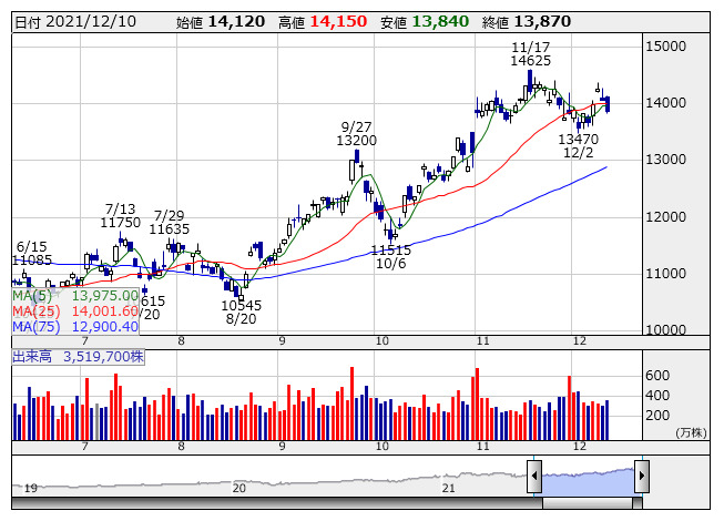 ダウ平均は216.30ドル高の35,970.99ドル、ナスダックは113.23ポイント高の15,630.60で取引を終了した。良好な企業決算を好感し寄り付き後、上昇。11月消費者物価指数(CPI)が39年ぶり最大の伸びを記録したため一時下落に転じる局面もあったが、想定内で金利が低下したほか、疾病管理予防センター(CDC)が初期の調査で、オミクロン株によるワクチン接種完了者に対する影響は緩やかとの結果を発表したため上昇に転じた。引けにかけて上げ幅を拡大。