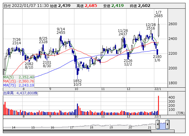 <3186> ネクステージ 2602 +413 (+18.9%)