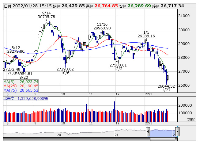 日経平均 <日足> 「株探」多機能チャートより日本取引所が公表した先物手口情報によると、1月28日の日経225先物期近(2022年3月限)の日中取引(立会内・J-NETの合算)で、買い越しトップは野村証券の4824枚、売り越しトップはABNクリアリン証券の7081枚だった。
