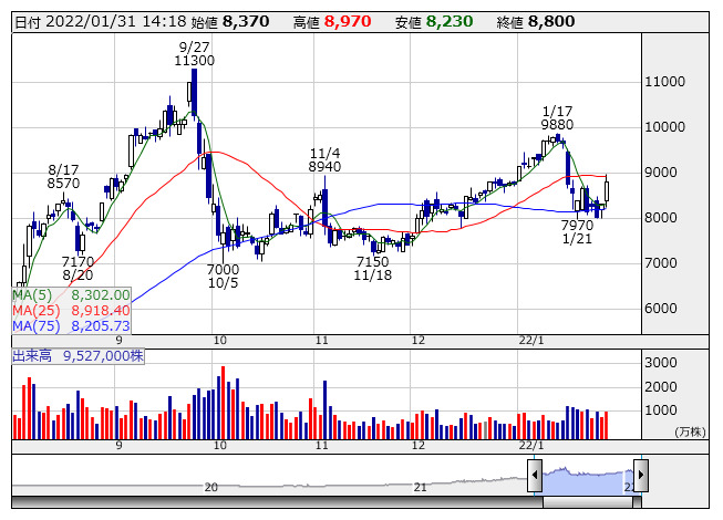 9104>がきょう昼ごろに22年3月期業績見通しと配当予想の大幅上方修正を発表、純利益を前期比7倍の6300億円としたほか、期末配当を750円に引き上げ年1050円とする見通しを示した。商船三井は今期に入り、通期上方修正と増配の同時発表をこれまで昨年7月と10月の2回行っており、特に7月の上方修正発表はその後の海運株物色の号砲となった経緯がある。同じくきょう昼に通期上方修正を発表した川崎近海汽船<