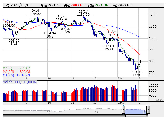 2022年02月03日08時46分 【市況】マザーズ先物:3日寄り付き=23ポイント安、782ポイント マザーズ指数 <日足> 「株探」多機能チャートより 3日8時45分、東証マザーズ指数先物期近2022年3月限は前日清算値比23ポイント安の782ポイントで寄り付いた。前日の東証マザーズ指数の現物終値808.64ポイントに対しては26.64ポイント安。夜間取引の終値799ポイントに対しては17ポイント安となっている。 株探ニュース